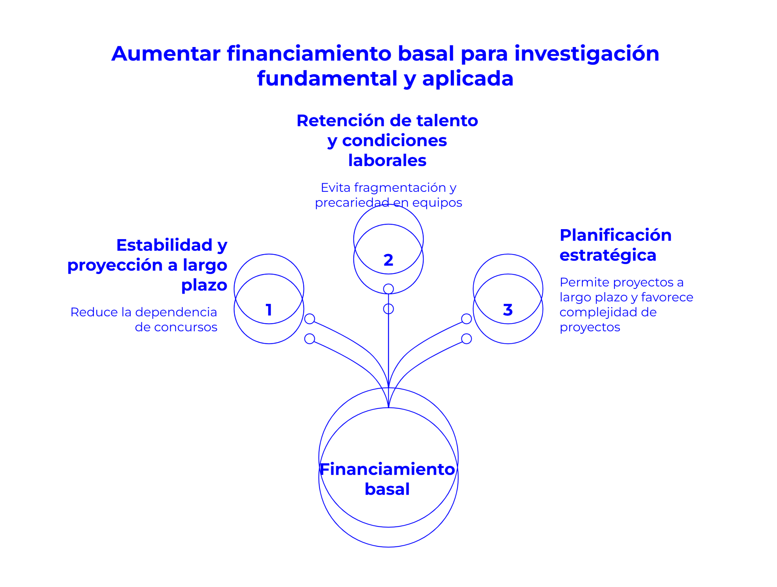 Proporcionar financiamiento basal estable a centros de investigación y universidades para asegurar la continuidad de proyectos y la estabilidad laboral de los investigadores