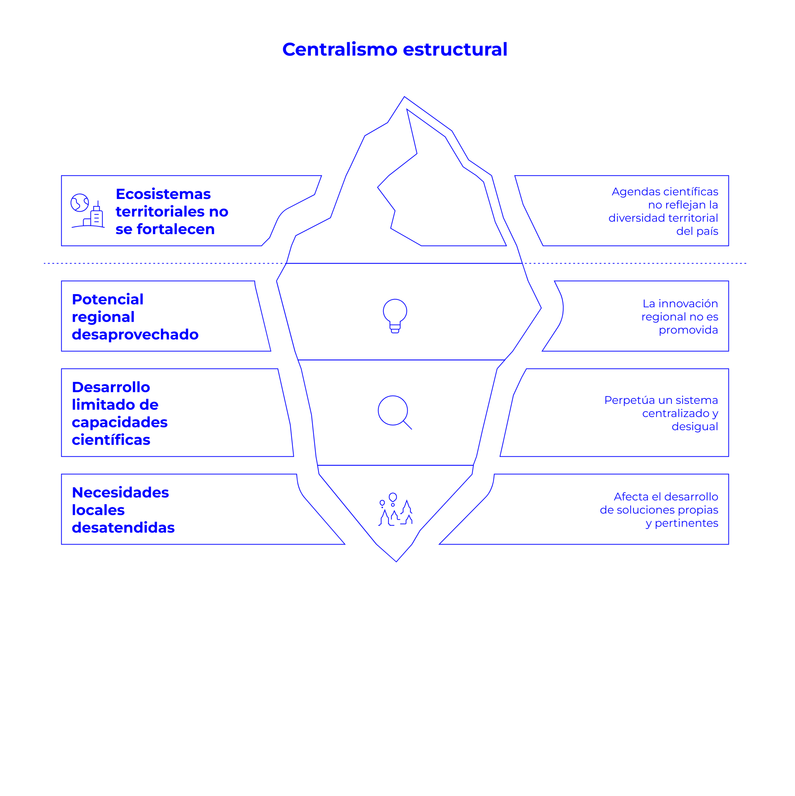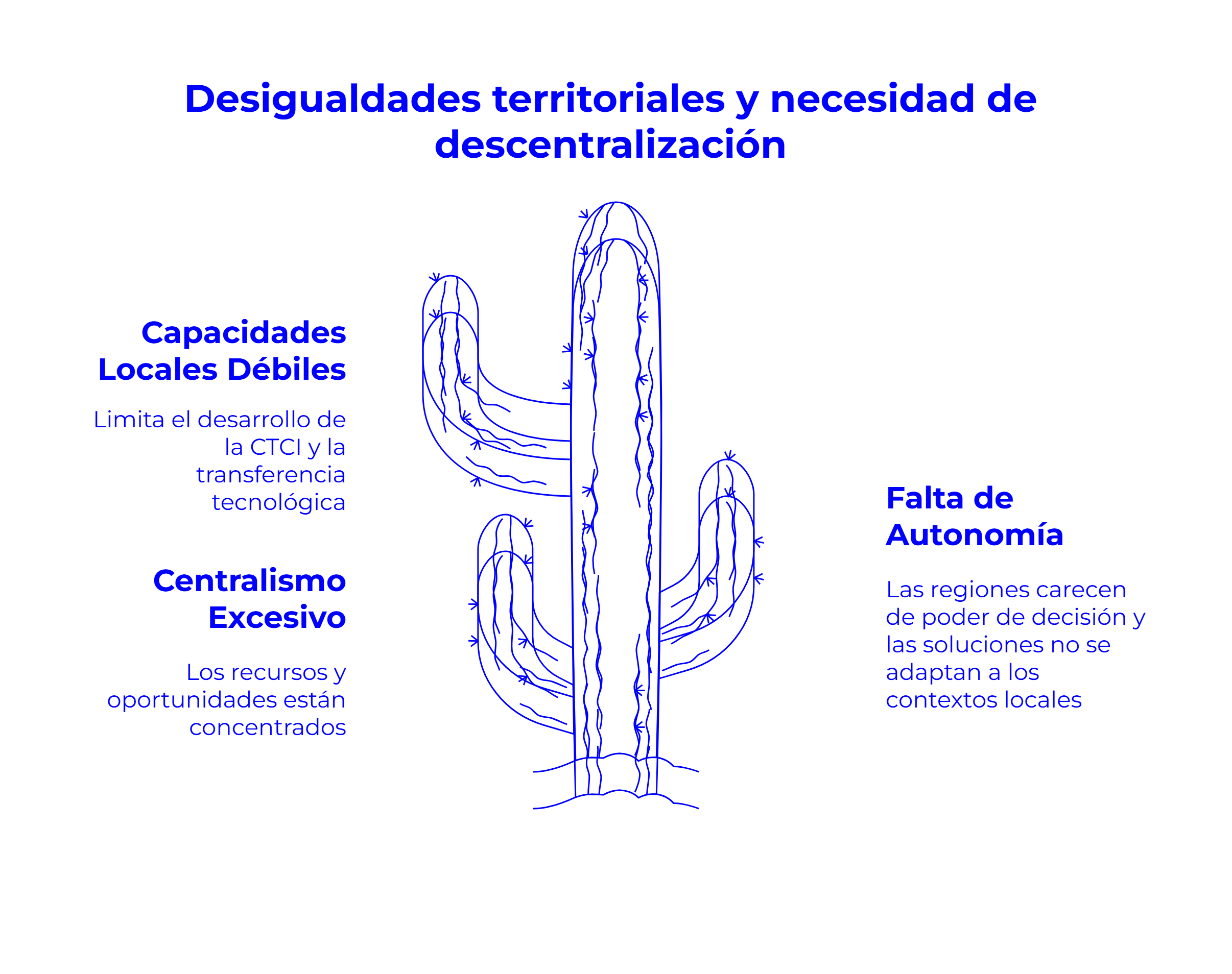 La desigualdad social y territorial es un fenómeno histórico en Chile, expresada en el excesivo centralismo de recursos y oportunidades, es vista como un obstáculo significativo para el desarrollo equitativo del país. La necesidad de descentralizar, dar autonomía a las regiones y fortalecer las capacidades locales de CTCI, así como de fomentar la transferencia tecnológica, permitirían potenciar los ecosistemas territoriales, generar soluciones adaptadas a los contextos locales y así reducir las brechas existentes.