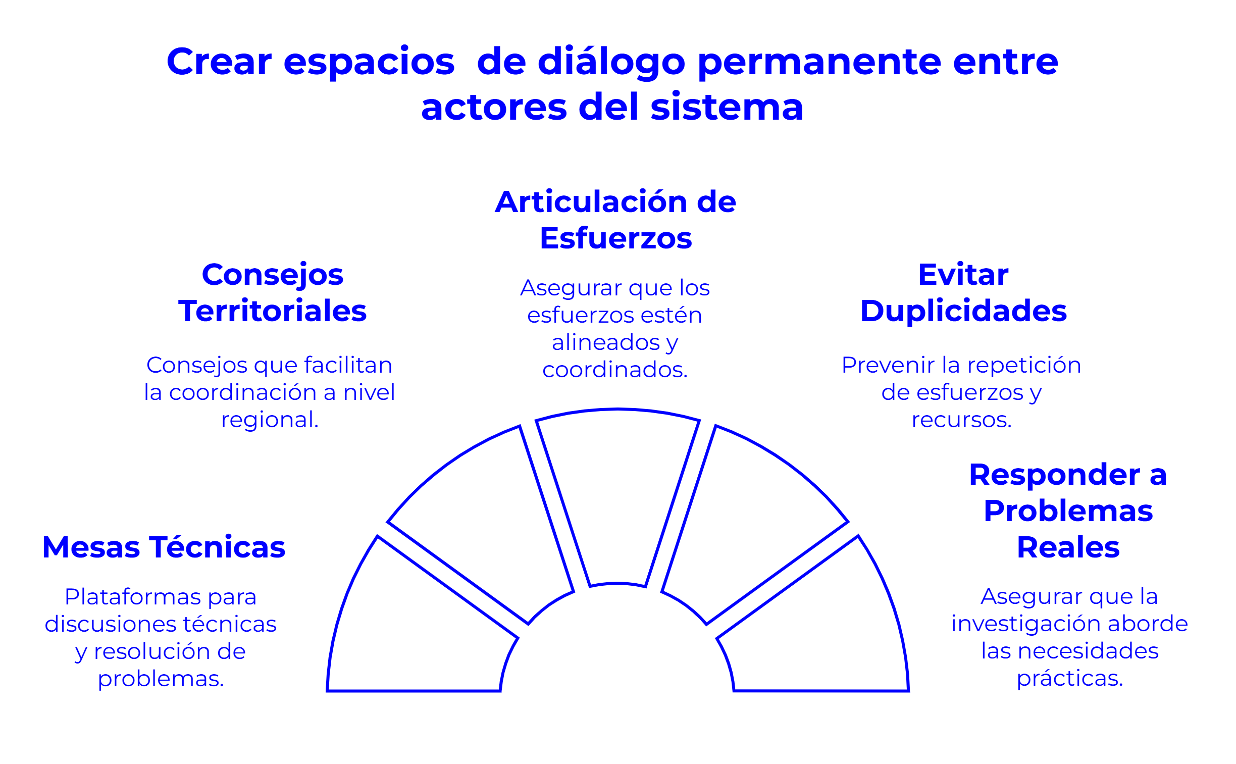 La creación de espacios de diálogo permanente entre los actores del sistema es vista como esencial para mejorar la coordinación y colaboración en el ecosistema de CTCI. Estos espacios, como mesas técnicas y consejos territoriales, permitirían una mejor articulación de esfuerzos, evitando duplicidades y asegurando que las investigaciones respondan a problemas reales del país.