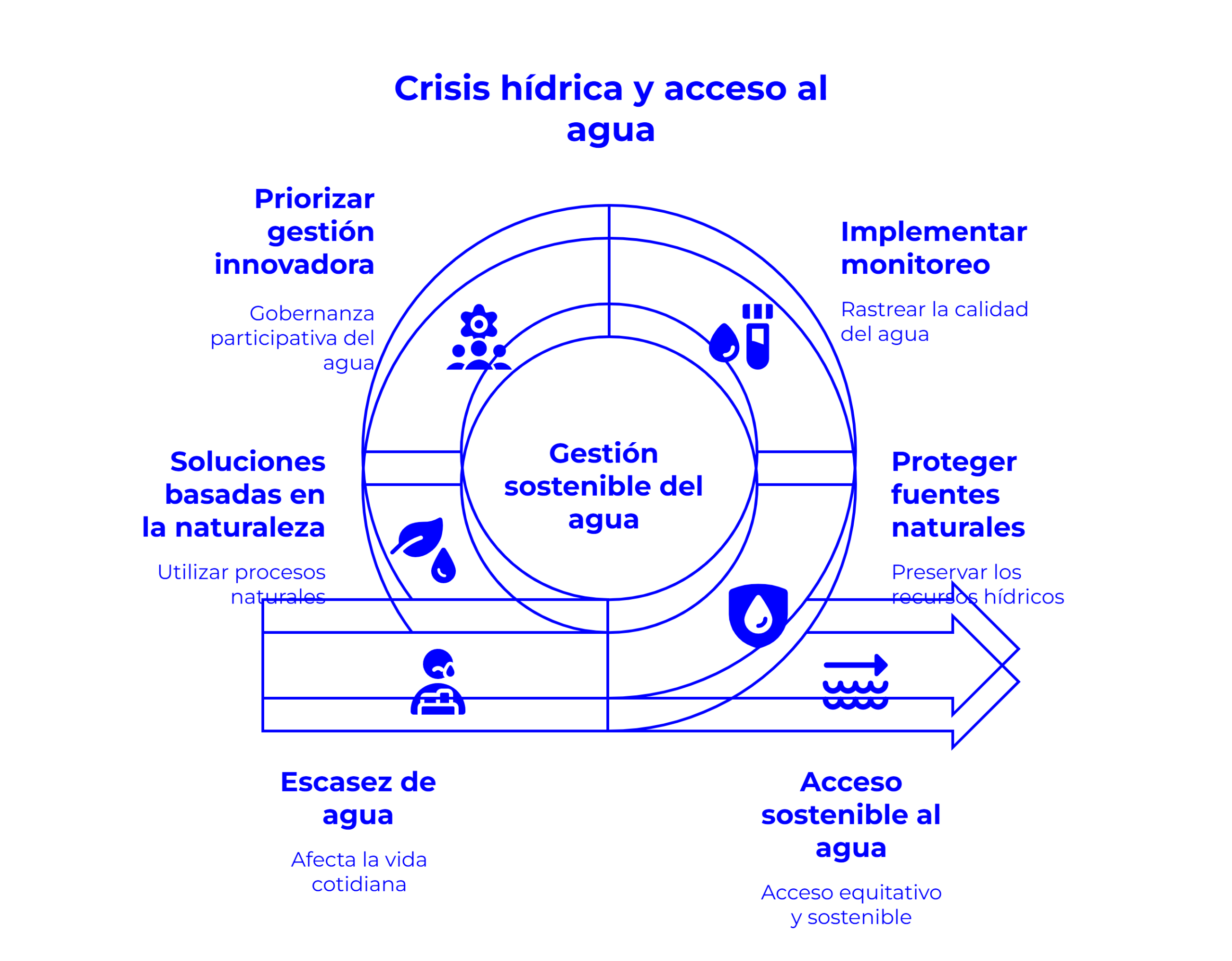 Intensificada por los efectos del cambio climático, la escasez de agua es vista como un problema urgente que afecta la vida cotidiana de las comunidades, a través de la salud, la seguridad alimentaria, el desarrollo productivo y la sostenibilidad de los ecosistemas en que habitan. Se sugiere la protección de fuentes naturales, implementación de tecnologías de monitoreo de su calidad, la priorización de formas de gestión innovadoras que consideren una gobernanza participativa del recurso y soluciones basadas en la naturaleza para abordar este desafío y garantizar el acceso equitativo y sostenible al agua.