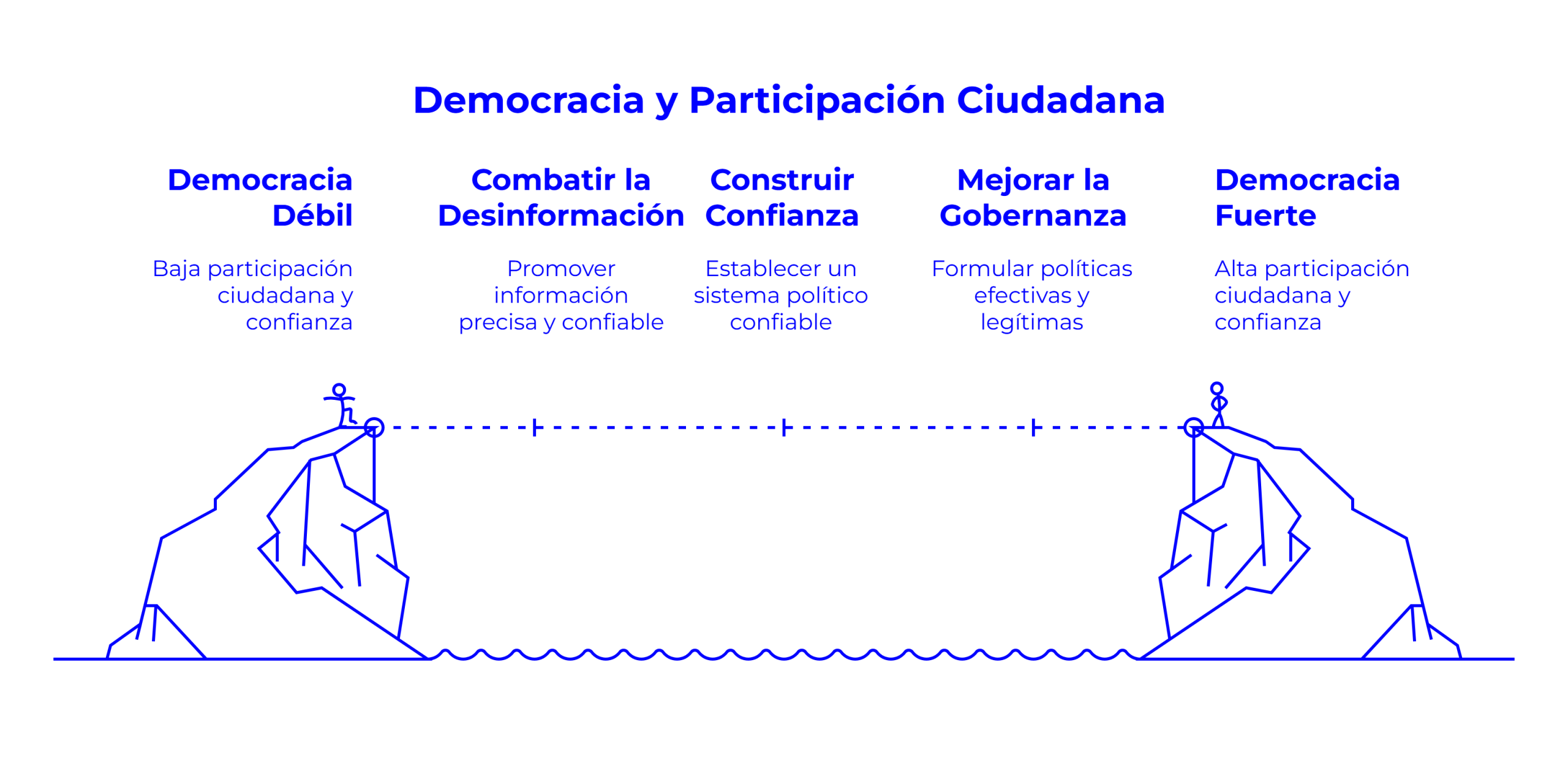 La necesidad de fortalecer la democracia y la participación ciudadana es vista como crucial para mejorar la calidad del debate público y formular políticas efectivas. Se menciona la importancia de combatir la desinformación y promover un sistema político confiable, para así enfrentar la crisis de legitimidad y mejorar la gobernanza.