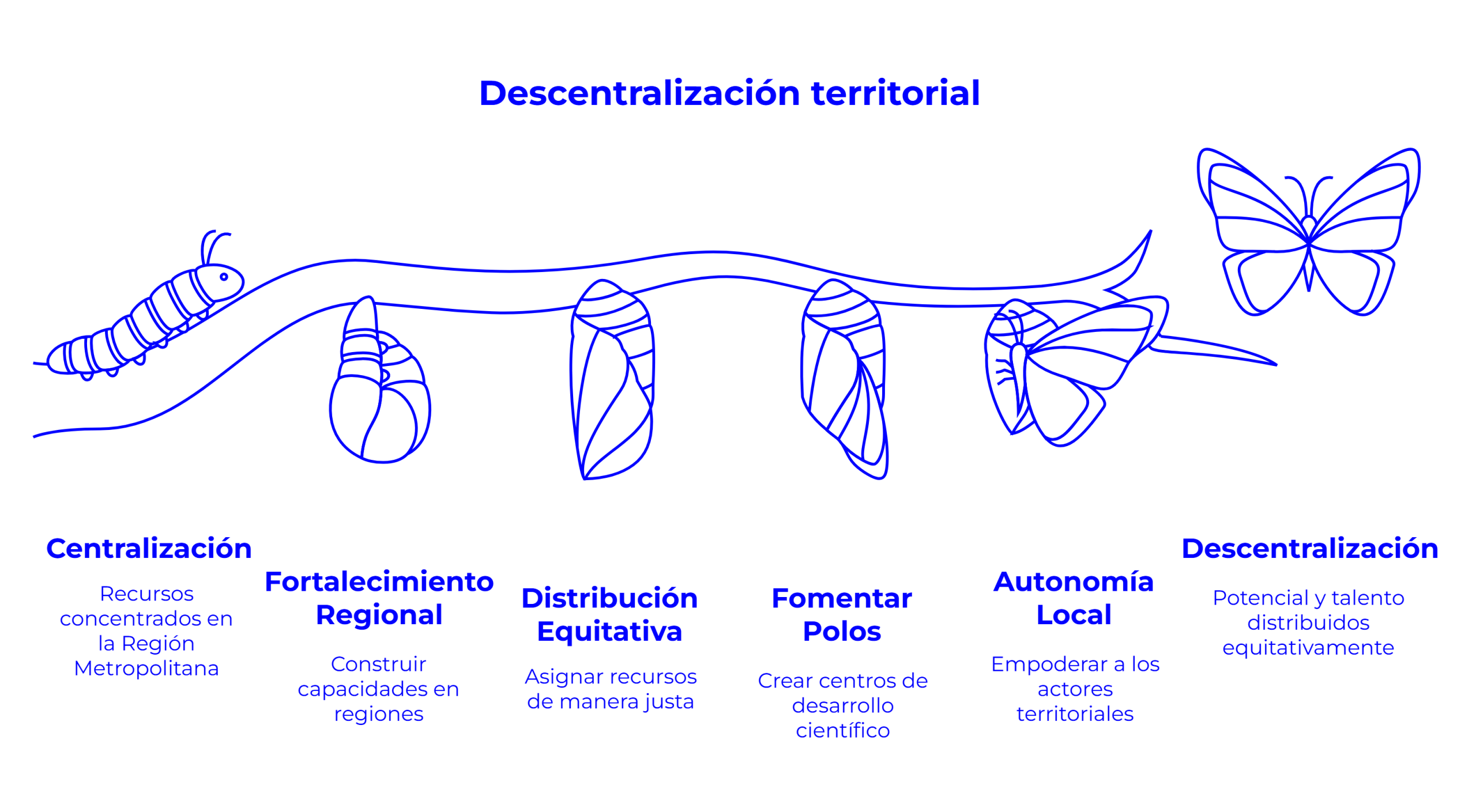 Avanzar hacia una descentralización efectiva de la ciencia, tecnología e innovación se entiende como una oportunidad fundamental para aprovechar el potencial y los talentos distribuidos en el país. Esto implica fortalecer capacidades regionales, propiciar una distribución más equitativa de recursos respecto de la Región Metropolitana, fomentar polos de desarrollo científico en distintos territorios, fortalecer la autonomía local, articular a los distintos actores territoriales y reducir con las brechas históricas, promoviendo soluciones adaptadas a las necesidades de cada territorio.