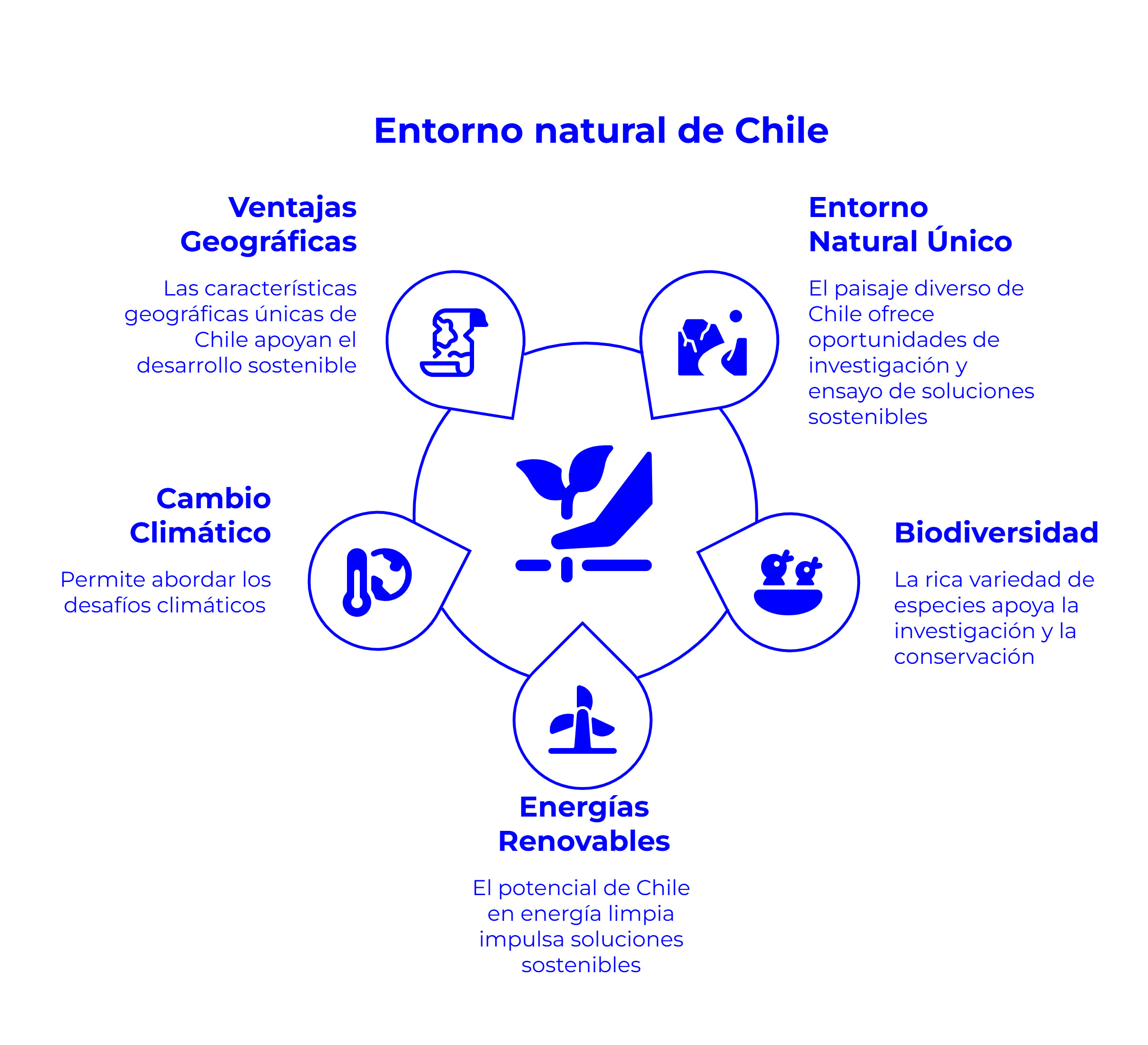 El entorno natural único de Chile es visto como un laboratorio natural que ofrece oportunidades para la investigación y el desarrollo de soluciones sostenibles en CTCI. Este recurso estratégico puede posicionar al país como líder en áreas como la conservación y la biotecnología, orientando esfuerzos hacia soluciones de sustentabilidad y aprovechamiento de ventajas comparativas en áreas como la biodiversidad, energías renovables y cambio climático. Se destaca la necesidad de valorizar las particularidades geográficas del país y aprovecharlas para el desarrollo sostenible