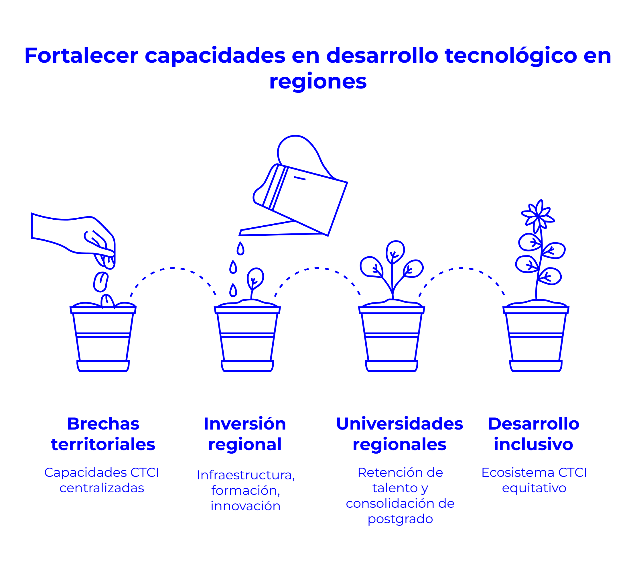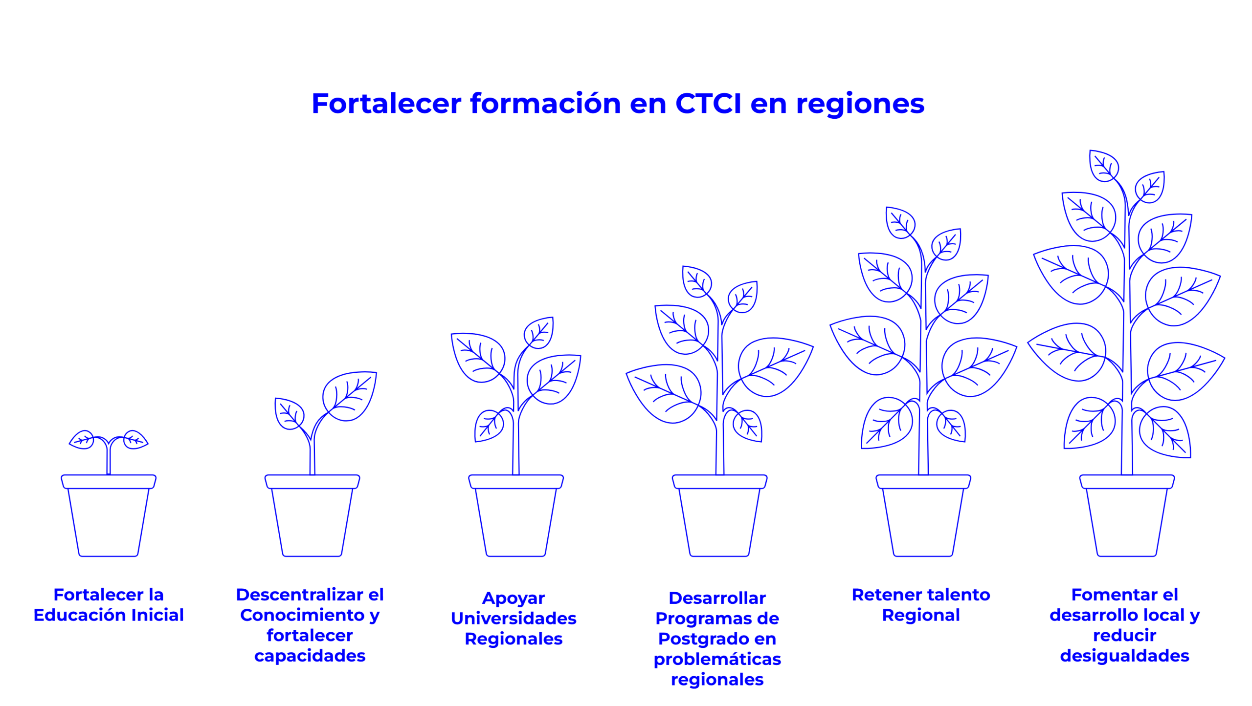Descentralizar la inversión y decisiones en CTCI, adaptando políticas y estrategias a las realidades, necesidades y oportunidades específicas de cada región.