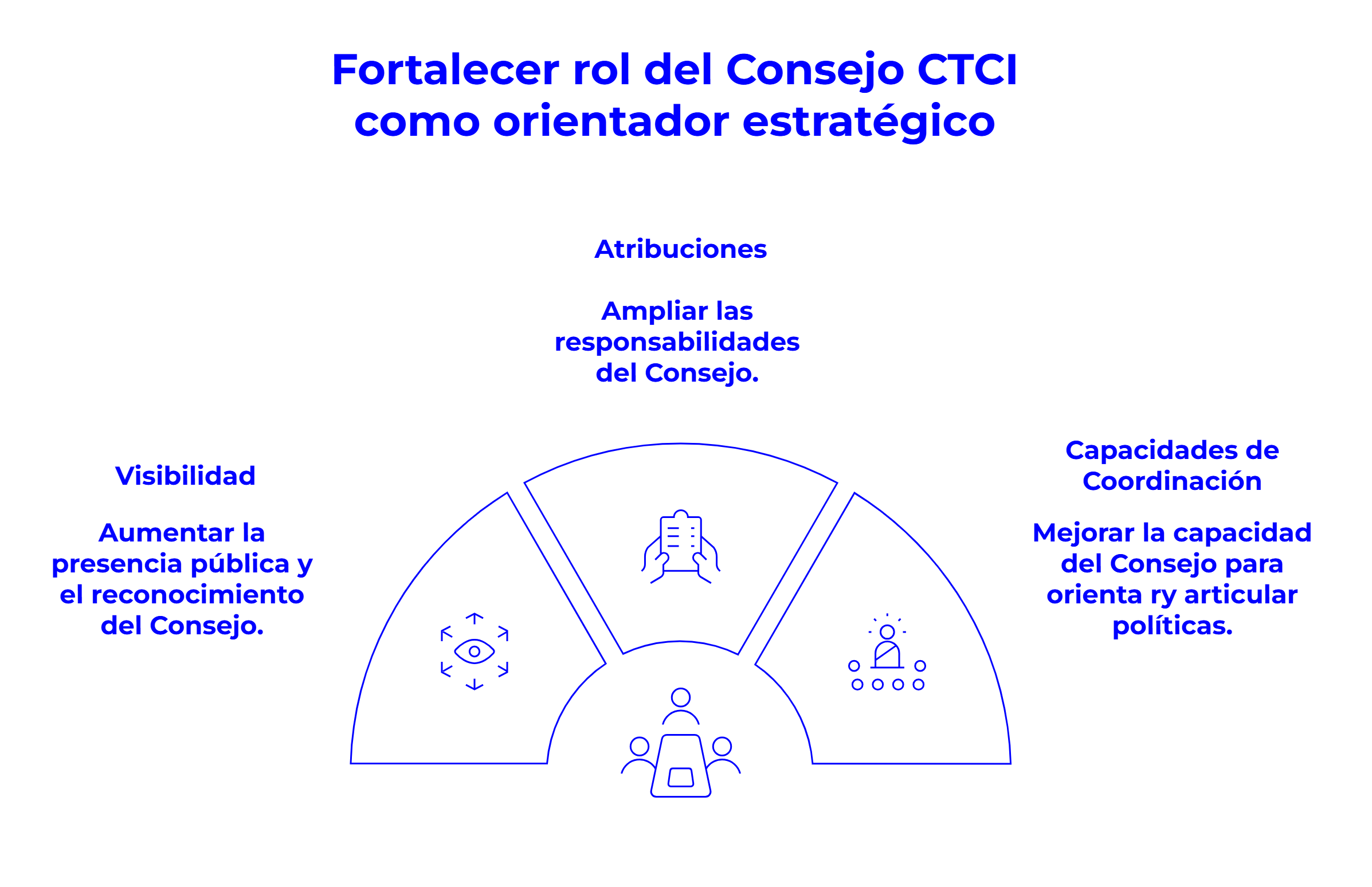 Se destaca la importancia de fortalecer el rol del Consejo CTCI como un organismo líder y estratégico en la orientación de políticas públicas. Se propone que el Consejo tenga mayor visibilidad, atribuciones y capacidades de coordinación para asegurar una orientación estratégica coherente y articulada con los desafíos del país.