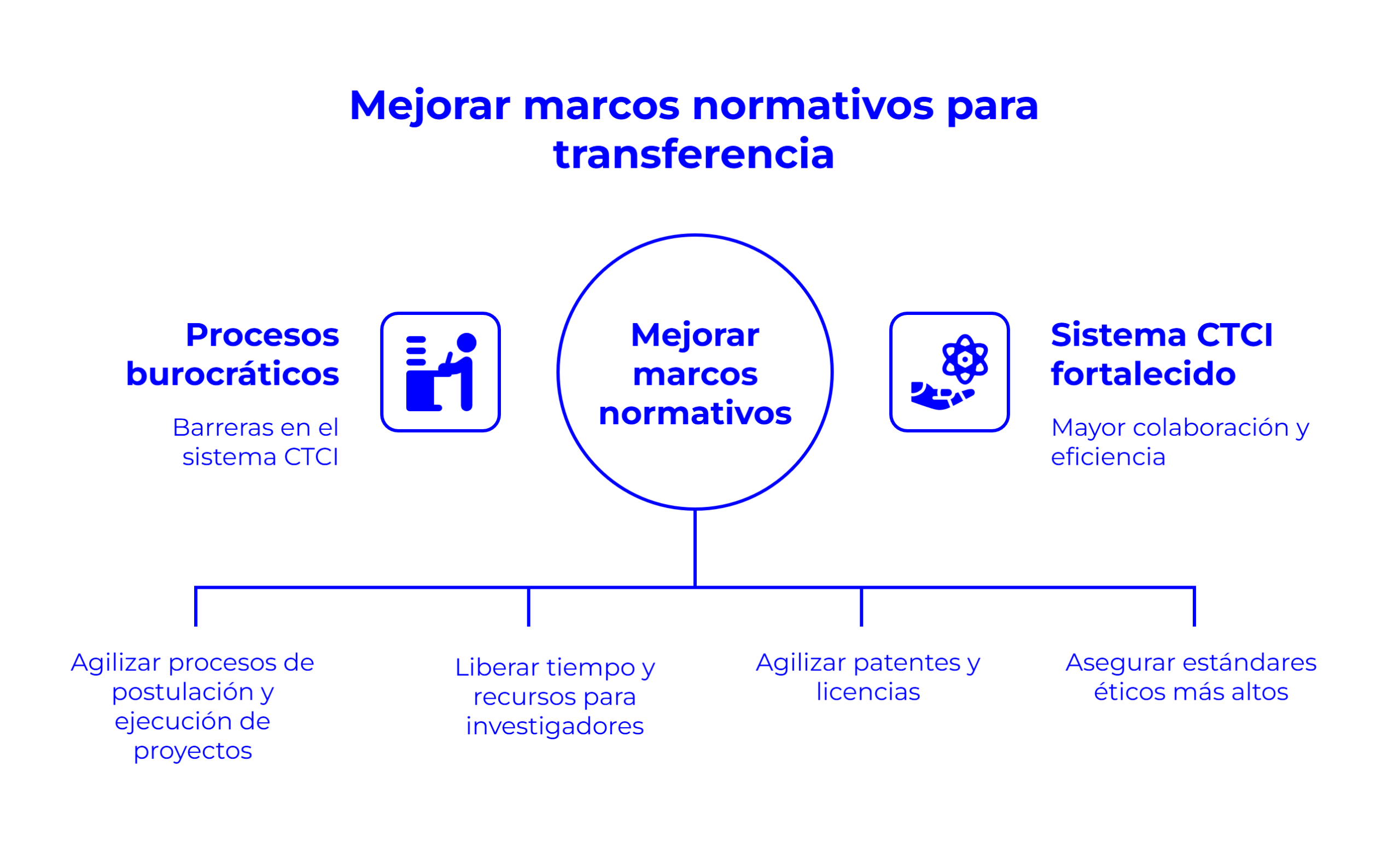 La simplificación de trámites y procesos burocráticos se plantea como una condición esencial para fortalecer el sistema CTCI. Éstos se consideran como barreras que se expresan especialmente en los procesos de postulación, ejecución y cierre de proyectos, disminuyendo la competitividad y eficiencia del ecosistema científico. Mejorar los marcos normativos y favorecer las operaciones digitales, permitiría liberar tiempo y recursos hoy absorbidos por gestiones administrativas, favoreciendo que los investigadores se concentren en la generación de conocimiento. Se propone actualizarlos con una orientación que permita agilizar la tramitación de patentes y licencias, y mejorar la transparencia en el uso de fondos públicos para asegurar estándares éticos más altos. Una gestión más ágil también impulsaría la transferencia tecnológica y la colaboración con la industria, reduciendo obstáculos que frenan la innovación.