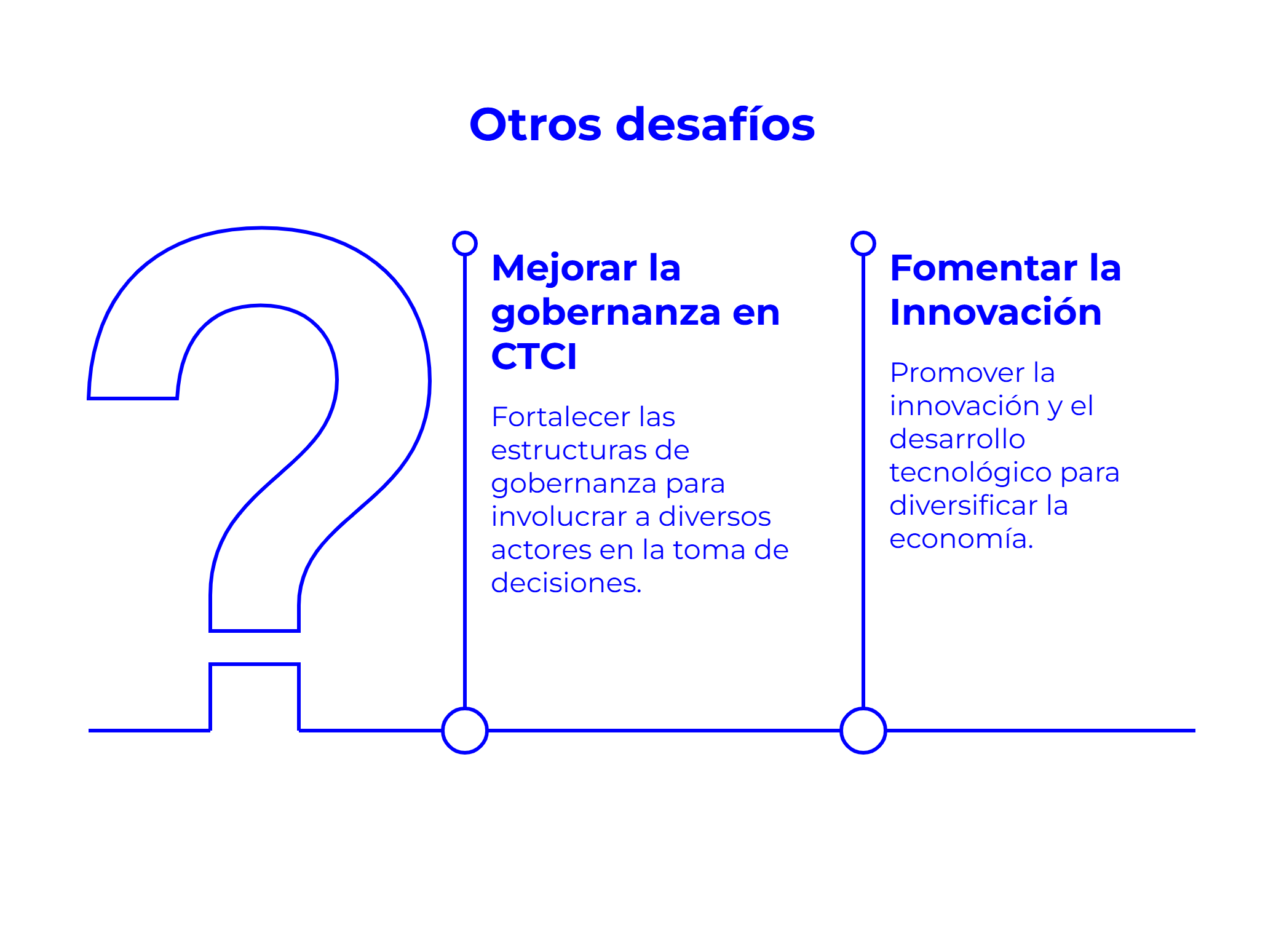 Existen dos desafíos principales asociados a esta categoría: el primero refiere a mejorar las estructuras de gobernanza en CTCI, favoreciendo la incorporación de los distintos actores del ecosistema en la toma de decisiones. El segundo, alude a la “Innovación y desarrollo tecnológico”, cuyo abordaje se considera crucial en la tarea de diversificar la economía y generar valor agregado a los bienes y servicios. Esto incluye la creación de empresas de base científico-tecnológica y la transferencia de tecnología.