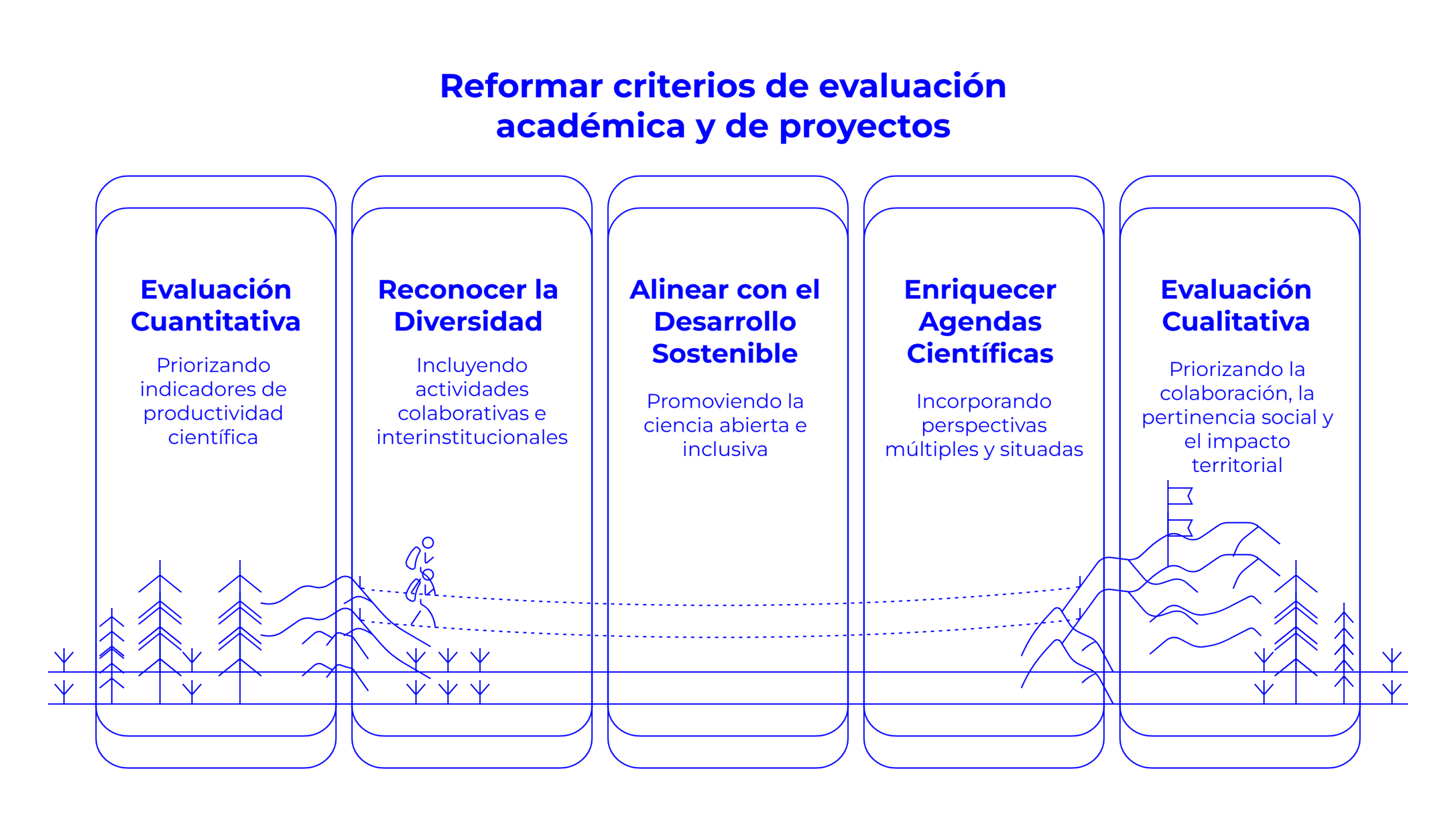 Reformar los criterios de evaluación académica y de proyectos es vista como una tarea urgente, transitando desde un sistema que solo prioriza indicadores cuantitativos de productividad científica en revistas de alto impacto, a uno que pondere la colaboración, la pertinencia social y el impacto territorial. Este cambio permitiría alinear la investigación con los objetivos de desarrollo sostenible, promoviendo una ciencia más abierta, inclusiva y conectada con las necesidades reales de la sociedad. Se propone reconocer la diversidad de actividades académicas, incluyendo procesos de colaboración interinstitucional y con comunidades locales. Se considera que esta democratización del conocimiento enriquecería las agendas científicas con perspectivas múltiples y territorialmente situadas.