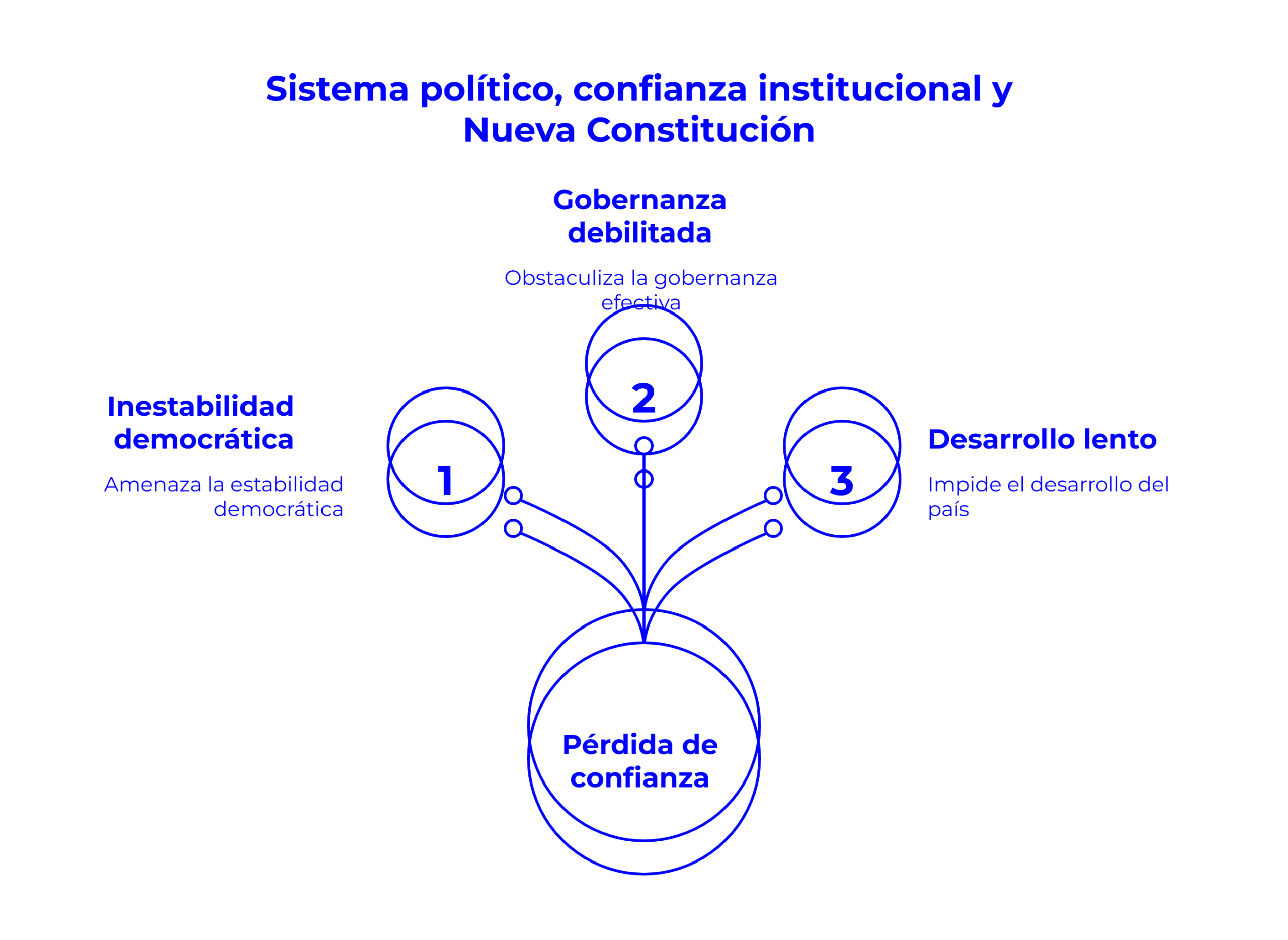 El 4,8% de las menciones de priorización de desafíos fueron paea”Sistema político, confianza institucional y Nueva Constitución”. La pérdida de confianza en las instituciones públicas y el sistema político es un tema recurrente, y se observa como un obstáculo para el desarrollo. Se considera fundamental reconstruir esta confianza para asegurar la estabilidad democrática, la gobernanza y el desarrollo del país, restaurando la credibilidad y la probidad institucional, a través de mayor transparencia, evaluación sistémica y participación ciudadana.