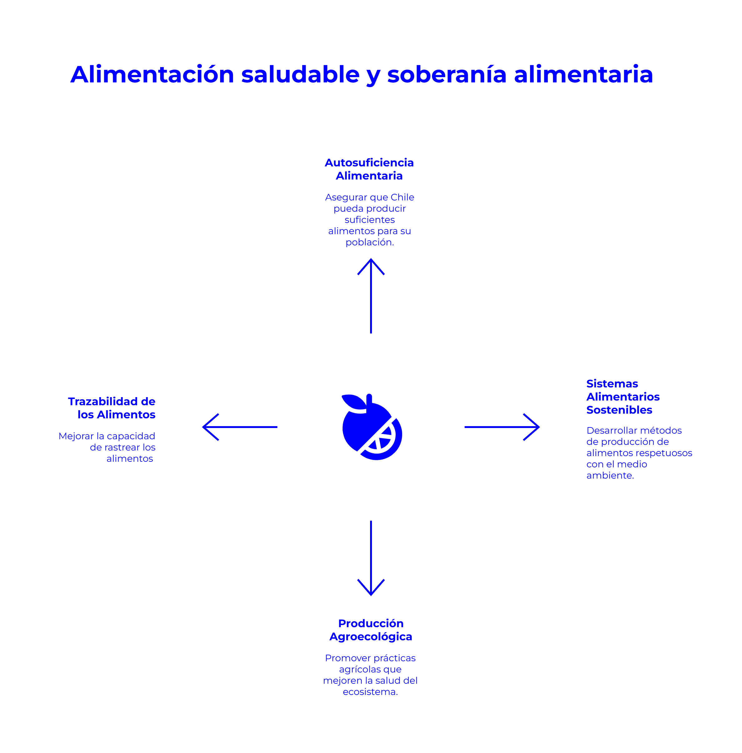 Garantizar una alimentación saludable y la soberanía alimentaria del país se percibe como fundamental para el bienestar de la población. Se destaca la necesidad de que Chile no solo sea un país productor de frutas para exportación, sino también sea capaz de ser autosustentable, disponiendo de alimentos para su población, innovando en sistemas alimentarios sostenibles y accesibles, que promuevan la seguridad alimentaria y la salud pública, mediante el impulso de la producción agroecológica y la mejora de la trazabilidad de los alimentos.