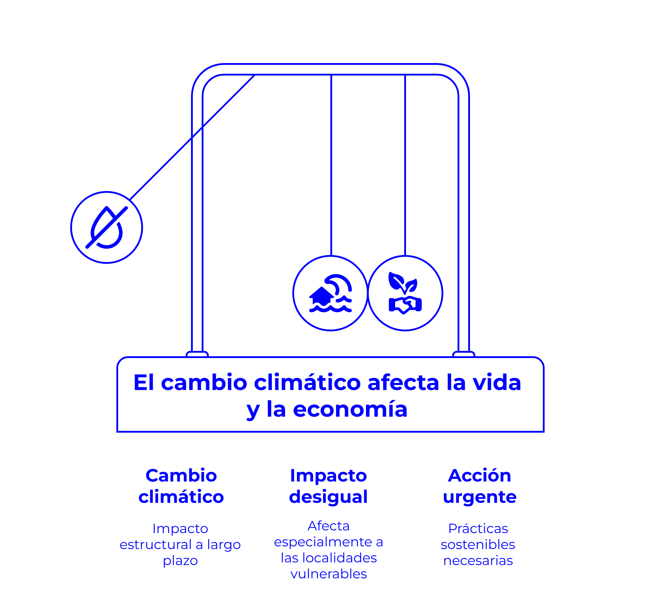 El cambio climático es identificado como una amenaza persistente con profundo impacto estructural en múltiples aspectos de la vida, incluyendo la salud de las personas y la actividad económica. Sus efectos son desiguales entre los territorios, afectando con particular fuerza a las localidades más vulnerables.